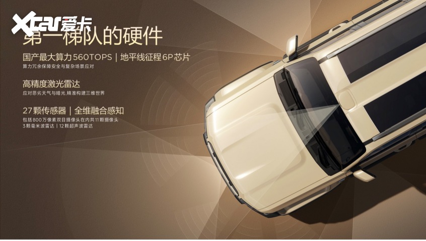 作为iCAR与地平线深度联合打造的重磅车型,iCAR V27搭载专属「超级猎鹰700+」智能辅助驾驶系统,以顶尖软硬件配置构建起全场景智驾核心竞争力,成为全球算力最强的硬派方盒子SUV。硬件层面,新车搭载国产最大算力的地平线征程6P芯片,单颗算力高达560TOPS,性能较主流Orin X芯片强一倍,单芯片理论最高支持L4级辅助驾驶,为未来能力进化预留充足空间,实现「五年不过时」的持续生长;同时配备27颗高精度传感器,含激光雷达、800万像素双目摄像头等,构建360°多模态融合感知网络,激光雷达最大探测距离超200米,即便在逆光、夜间、恶劣天气等场景下,也能做到看得清、辨得明,为智驾安全筑牢基础。