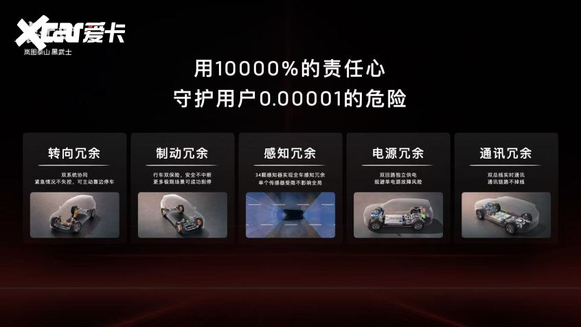 为保障L3级有条件自动驾驶的安全要求,岚图泰山打造了转向、制动、感知、通讯、电源五大安全冗余设计,构筑起双重安全保障。转向系统配备2套独立传感器、双电源供电、双控制单元等六重冗余,主副系统同时工作降低失效概率;制动系统新增RBU控制器,相较于L2.9级别实现硬件升级;电源采用a/b双供电网,任意一路短路另一路可无缝接棒;34颗全冗余感知硬件确保单个传感器受限不影响全局;双总线实时通讯保障控制信号链路不掉线。在央视直播的封闭场地测试中,岚图泰山面对驾驶者失能、前车掉落障碍物、异物遮挡视线等危机场景,能快速做出正确驾驶决策,在悬空、极窄车位中也能精准完成自动泊车,充分验证了其智驾安全实力。