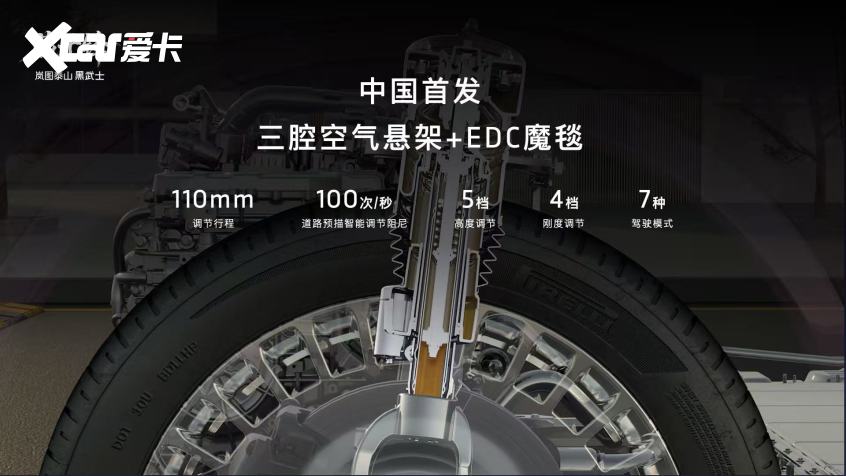 在底盘与驾控层面,岚图泰山刷新了高端SUV的性能标准。作为国内首发搭载三腔空气悬架的旗舰SUV,其配合EDC魔毯底盘及双向16°后轮独立转向技术,实现了百万级驾控体验。三腔空簧通过2个刚度阀控制3个工作气室,拥有4种弹簧刚度组合、5档高度调节、7种驾驶模式,调节行程达110mm,能毫秒级响应路况并智能调节阻尼,有效抑制35%的刹车俯仰与20%的过弯侧倾;后轮独立转向让车辆转弯半径仅5.4米,窄路掉头、车库泊车如紧凑车般灵活。同时,车辆采用前双叉臂+后五连杆底盘结构,核心部件使用航空级铝合金,兼顾结构强度、轻量化与耐腐蚀性,无论是城市通勤、高速疾驰还是非铺装路面,都能实现操控与舒适的完美平衡。