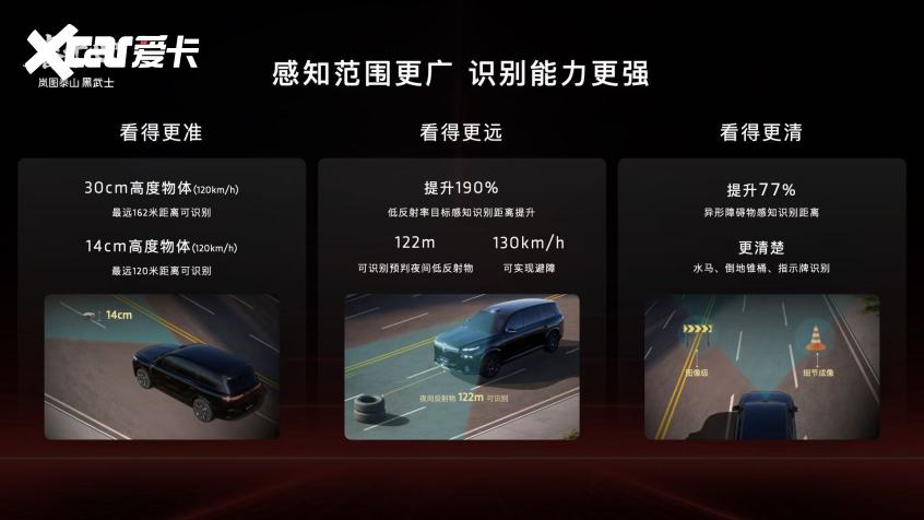 在智能驾驶核心硬件上,岚图泰山实现了行业断层式领先。Ultra版与黑武士版均搭载全球量产最高规格的896线双光路图像级激光雷达,搭配3颗DTOF近程补盲激光雷达,组成四激光雷达矩阵,再加上34颗智慧传感器构建的融合感知体系,实现了全场景无死角感知。相较于传统192线激光雷达,896线双光路图像级激光雷达分辨率提升4倍,单颗雷达集广角与长焦于一体,针对30cm高度障碍物最远识别距离达162米,14cm小目标识别距离可达120米,低反射率目标感知识别距离提升190%,夜间122米可精准识别黑色轮胎、深色植被等低反射物,还能实现130km/h高速避障,真正完成了从“点云级”到“图像级”的跨越,成为当前行业感知硬件的“天花板”。